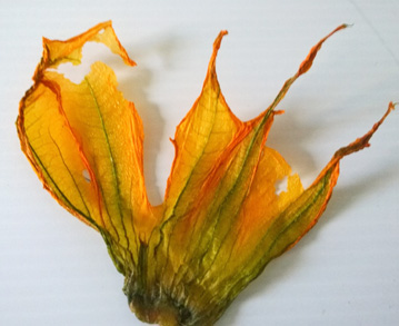 Shown to left is a dehydrated zucchini blossom that was initially frozen during summer. Spreading the blossom out on the mesh rack and dehydrating for 30 minutes resulted in a very flavorful, crispy garnish. It is important to turn the flower over once before it begins to stick to the surface.